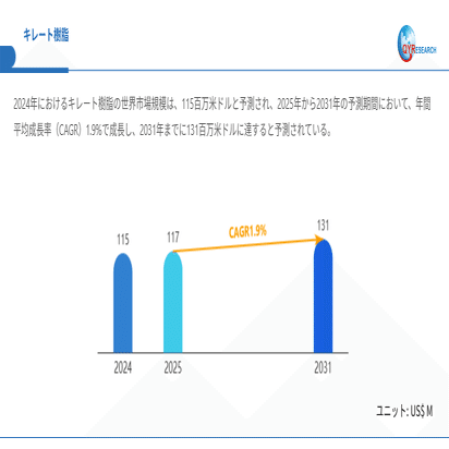 キレート樹脂の世界市場規模は2025年から2031年にかけて年平均成長率(CAGR)1.9%で拡大し、2031年には131百万米ドル規模に達する見込みです。市場は2024年に115百万米ドルと推定され、2025年には117百万米ドルに達すると予測されています。