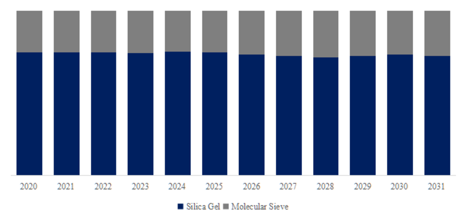 製品タイプ別では、現在シリカゲルが最大のセグメントであり、75.3%のシェアを保持しています。