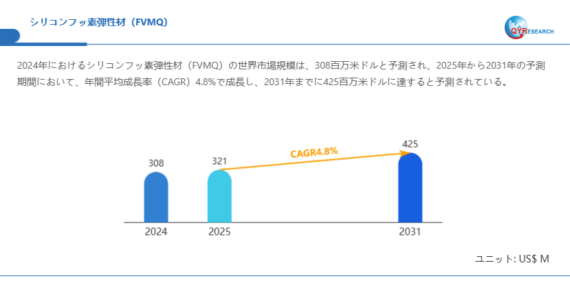 シリコンフッ素弾性材(FVMQ)の世界市場規模は2025年から2031年にかけて年平均成長率(CAGR)4.8%で拡大し、2031年には425百万米ドル規模に達する見込みです。市場は2024年に308百万米ドルと推定され、2025年には321百万米ドルに達すると予測されています。