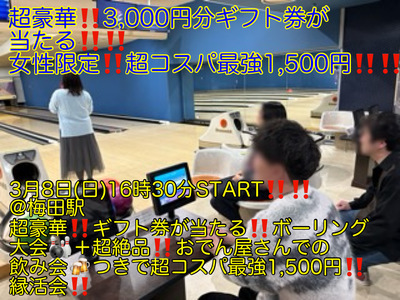 (超豪華!!3,000円分ギフト券が当たる!!+超コスパ最強1,500円!!)【3月8日(日)16時30分〜梅田駅】ボーリング+超絶品!!おでんを含む8品つき超コスパ最強縁活会