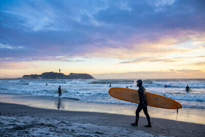 - 鵠沼海岸のドラマチックな夕暮れ(マジックアワー)を背景に、人々の営み(サーファー、散歩、シルエット)を捉える。